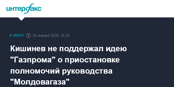 Москва. 26 января. INTERFAX.RU - Министерство энергетики Молдавии не поддержало предложения "Газпрома" о внутреннем аудите в АО "Молдовагаз" ("Газпром" контролирует более 60% акций) и приостановке полномочий исполняющего обязанности председателя правления компании Вадима Чебана, сообщила пресс-служба Минэнерго, которое представляет интересы правительства Молдавии в "Молдовагазе".