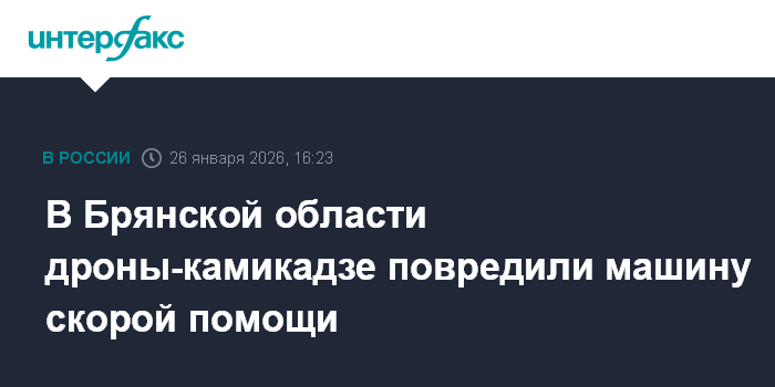 Москва. 26 января. INTERFAX.RU - В Климовском районе Брянской области дроны-камикадзе атаковали машину скорой помощи в селе Чуровичи, сообщил губернатор региона Александр Богомаз.