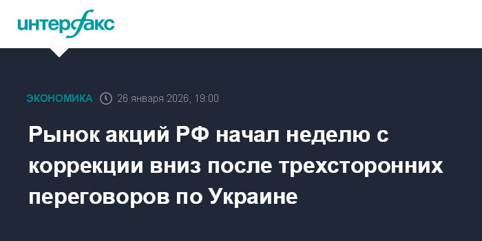 Москва. 26 января. INTERFAX.RU - Российский рынок акций в понедельник скорректировался вниз в рамках фиксации прибыли игроками после прошедших 23-24 января в Абу-Даби конструктивных трехсторонних переговоров между делегациями США, России и Украины относительно урегулирования украинского конфликта. Покупателей также сдерживала просевшая нефть (фьючерс на Brent опустился ниже $65,5 за баррель), а новые ценовые рекорды золота и серебра поддерживали спрос на бумаги золотодобывающих компаний.