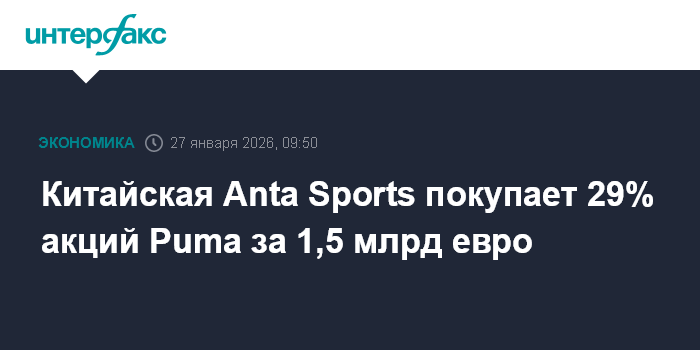 Москва. 27 января. INTERFAX.RU - Китайский производитель спортивных товаров Anta Sports Products Ltd. покупает 29,06% акций германской Puma SE за 1,5 млрд евро.