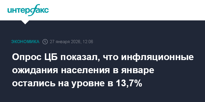 Москва. 27 января. INTERFAX.RU - Инфляционные ожидания населения РФ в январе 2026 года не изменились, состав 13,7%, следует из оперативной справки по итогам опроса "инФОМ", проведенного по заказу Банка России.