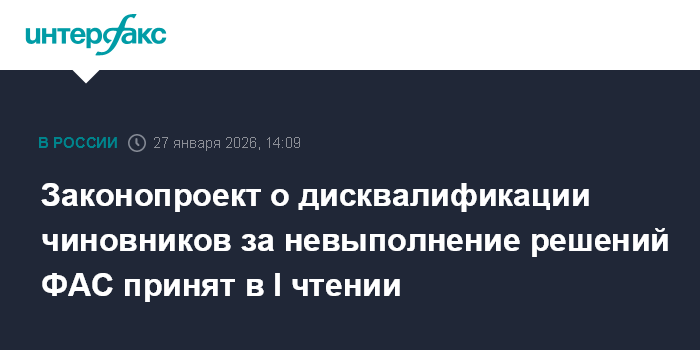 Москва. 27 января. INTERFAX.RU - Госдума на заседании во вторник приняла в первом чтении законопроект о дисквалификации должностных лиц на срок до трех лет за неоднократное невыполнение решения ФАС.