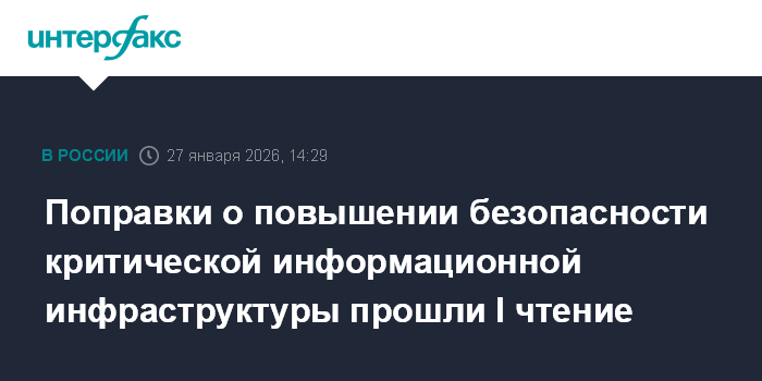 Москва. 27 января. INTERFAX.RU - Госдума приняла в первом чтении законопроекты, направленные на повышение безопасности критической информационной инфраструктуры. Законопроекты меняют КоАП и Уголовный кодекс.