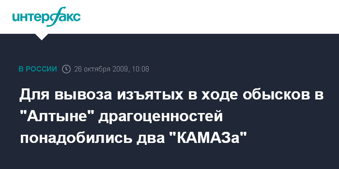 Как заявил в понедельник "Интерфаксу" представитель ЦОС ФСБ России, в ходе следственных действий, проведенных в офисах "Алтына" в Москве, Омске и Санкт-Петербурге, изъято в качестве вещественных доказательств большое количество ювелирных изделий. Этот груз вывозили двумя автомашинами "КАМАЗ", несколькими "Газелями".