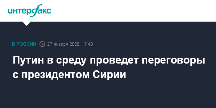 Москва. 27 января. INTERFAX.RU - В среду, 28 января, состоятся переговоры президента Российской Федерации Владимира Путина с президентом Сирии Ахмедом Шараа, который будет находиться в России с рабочим визитом, сообщает пресс-служба Кремля.