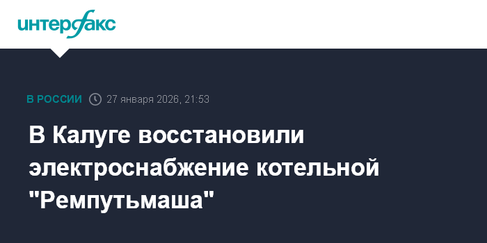 Москва. 27 января. INTERFAX.RU - В Калуге восстановили электроснабжение котельной "Ремпутьмаша", остановленной ранее во вторник из-за отключения электричества, сообщил глава городского округа Дмитрий Денисов.