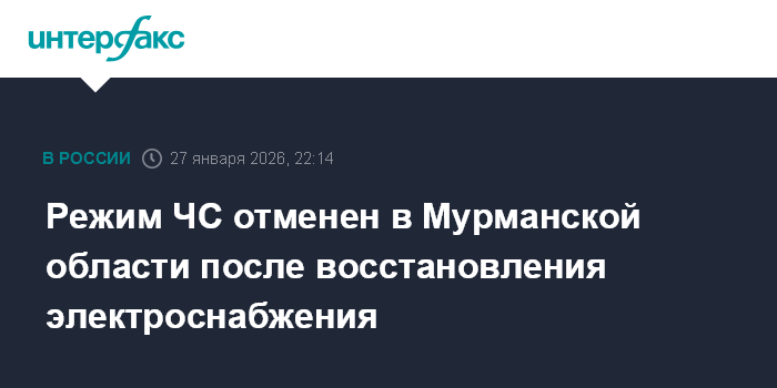 Москва. 27 января. INTERFAX.RU - Режим чрезвычайной ситуации, который был введен в Мурманской области 25 января в связи с обрушением пяти опор ЛЭП и перебоями в электроснабжении Мурманска и Североморска, снят, сообщил губернатор Андрей Чибис по итогам заседания оперативного штаба.