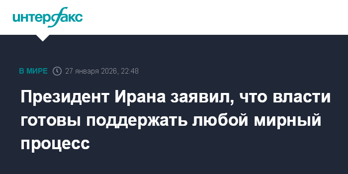 Москва. 27 января. INTERFAX.RU - Власти Ирана приветствуют любой процесс, который предотвращает войну и ведет к миру, заявил во вторник президент страны Масуд Пезешкиан.