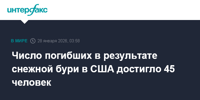 Москва. 28 января. INTERFAX.RU - По меньшей мере 45 человек стали жертвами сильной снежной бури и аномальных холодов, охвативших ряд штатов США, сообщает Associated Press со ссылкой на данные местных властей.
