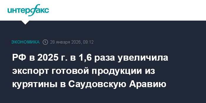 Москва. 28 января. INTERFAX.RU - РФ в 2025 году экспортировала в Саудовскую Аравию готовой или консервированной продукции из куриного мяса на $19 млн, что в 1,6 раза больше, чем в 2024 году. В натуральном выражении поставки выросли почти в 1,5 раза до 6,3 тыс. тонн, сообщает федеральный центр "Агроэкспорт".
