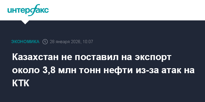 Москва. 28 января. INTERFAX.RU - Казахстан не поставил на экспорт порядка 3,8 млн тонн нефти из-за атак на Каспийский трубопроводный консорциум (КТК), сообщил министр энергетики республики Ерлан Аккенженов.