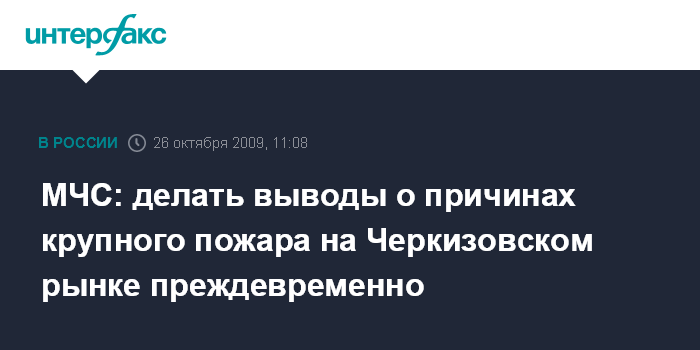 Москва. 26 октября. INTERFAX.RU - Следствие по факту крупного пожара на Черкизовском рынке столицы продолжается, сообщил заместитель начальника главного управления по надзорной деятельности МЧС России по Москве Сергей Аникеев. Он сообщил на пресс-конференции в центральном офисе "Интерфакса" в понедельник, делать выводы о причинах инцидента пока преждевременно.
