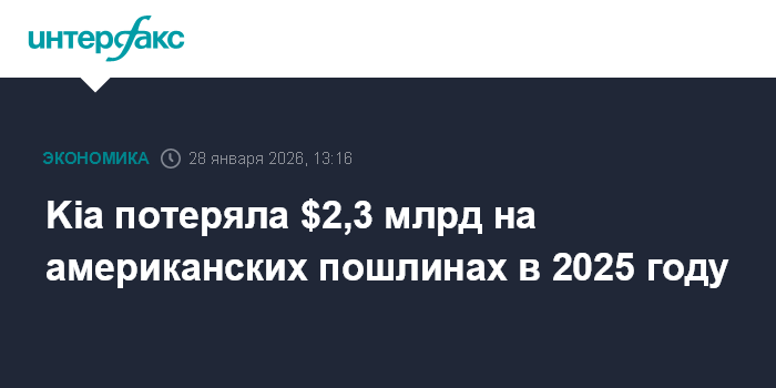 Москва. 28 января. INTERFAX.RU - Южнокорейский автопроизводитель Kia Corp. в 2025 году потерял 3,3 трлн вон ($2,3 млрд) из-за ведения пошлин на импорт товаров в США.