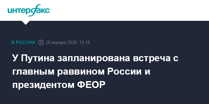 Москва. 28 января. INTERFAX.RU - Президент РФ Владимир Путин в среду примет главного раввина России и президента Федерации еврейских общин России (ФЕОР) Берла Лазара и Александра Бороду, а также пообщается с руководителем фонда "Талант и успех" Еленой Шмелевой, сообщил пресс-секретарь главы государства Дмитрий Песков.