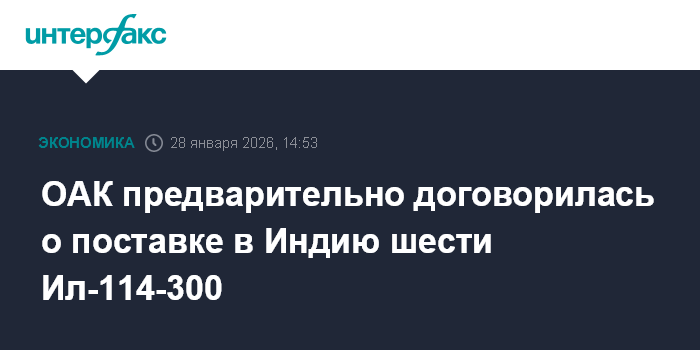 Москва. 28 января. INTERFAX.RU - ПАО "Объединенная авиастроительная корпорация" (ОАК, входит в "Ростех") и индийская компания Flamingo Aerospace заключили предварительное соглашение о поставке шести самолетов Ил-114-300, сообщила ОАК.
