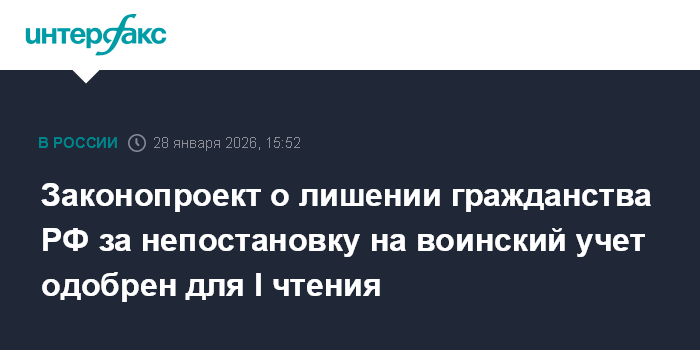 Москва. 28 января. INTERFAX.RU - Комитет Госдумы по безопасности в среду рекомендовал принять в первом чтении законопроект о лишении приобретенного гражданства из-за непостановки на воинский учет.