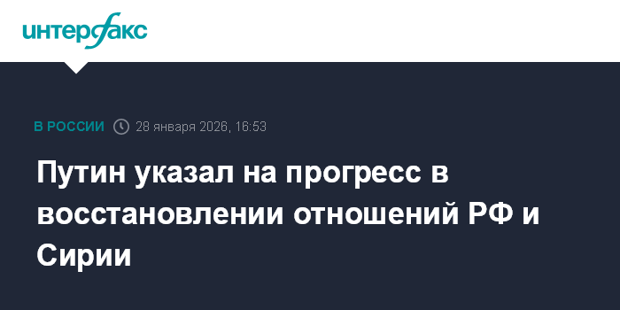 Москва. 28 января. INTERFAX.RU - России и Сирии удалось добиться прогресса в восстановлении межгосударственных отношений и налаживания взаимодействия в экономической сфере с момента предыдущего визита президента Ахмеда аш-Шараа в Москву, заявил президент РФ Владимир Путин.