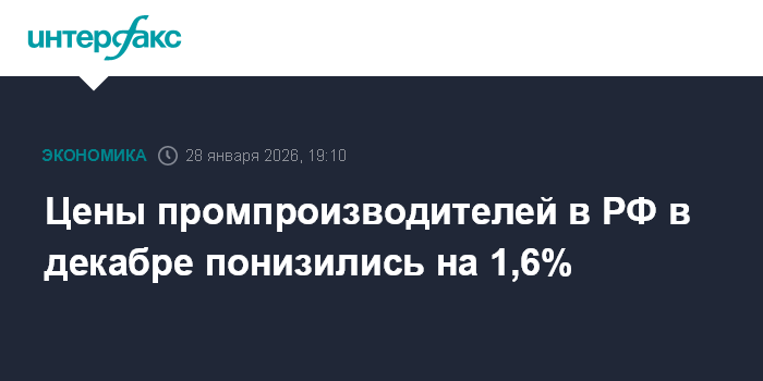 Москва. 28 января. INTERFAX.RU - Цены производителей промышленных товаров в РФ в декабре 2025 года снизились относительно предыдущего месяца на 1,6% после понижения на 0,9% в ноябре, роста на 0,9% в октябре, на 0,5% в сентябре, на 1,1% в августе и на 0,9% в июле (рост был зафиксирован впервые с февраля), сообщил в среду Росстат.