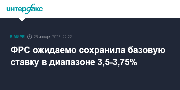 Москва. 28 января. INTERFAX.RU - Федеральная резервная система (ФРС) сохранила процентную ставку по федеральным кредитным средствам (federal funds rate) в диапазоне 3,5-3,75% годовых, говорится в сообщении Федерального комитета по операциям на открытых рынках (FOMC) по итогам заседания, завершившегося в среду.