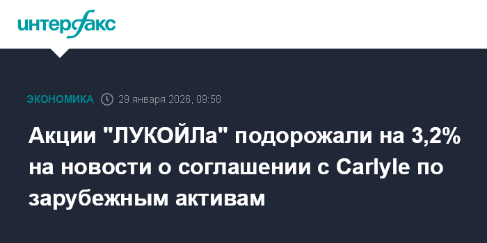 Москва. 29 января. INTERFAX.RU - Котировки "ЛУКОЙЛа" на "Московской бирже" подорожали на 3,2%, до 5385 рублей за штуку, на новостях о заключении соглашения с американской инвесткомпанией Carlyle о продаже зарубежных активов.