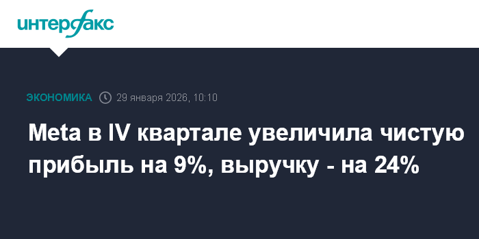 Москва. 29 января. INTERFAX.RU - Американская Meta Platforms (признана в РФ экстремистской организацией и запрещена) увеличила чистую прибыль в четвертом квартале 2025 года на 9%, выручку - на 24%, при этом оба показателя превзошли прогнозы рынка.