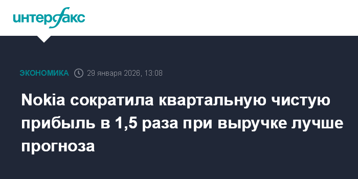 Москва. 29 января. INTERFAX.RU - Финский производитель телекоммуникационного оборудования Nokia в четвертом квартале 2025 года сократил чистую прибыль в 1,5 раза, при этом его скорректированная прибыль и выручка оказались лучше ожиданий рынка.