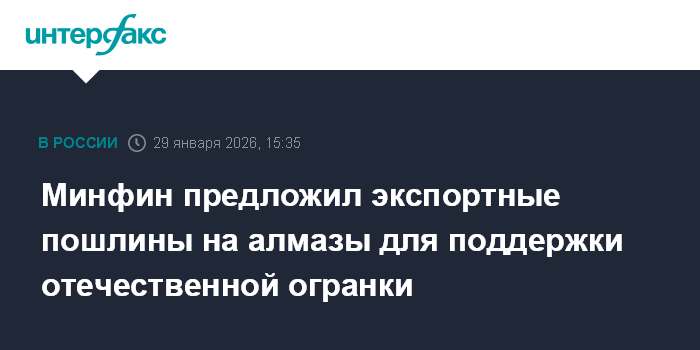 Москва. 29 января. INTERFAX.RU - Минфин готовит проект указа о введении экспортных пошлин на алмазы в рамках поддержки отечественной гранильной отрасли, заявил журналистам заместитель министра финансов Алексей Моисеев.