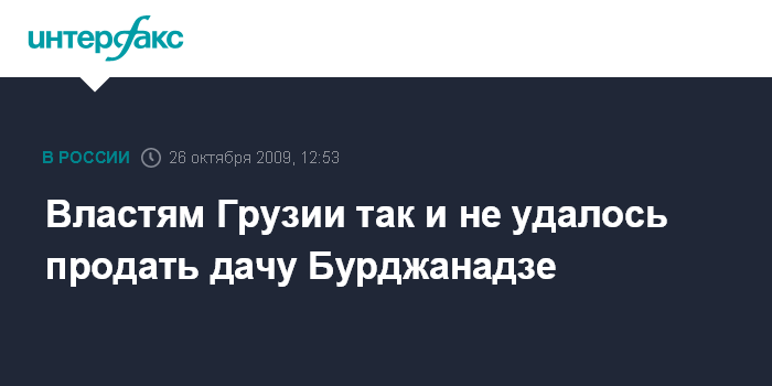 Москва. 26 октября. INTERFAX.RU - Дача в Цхнети (пригород Тбилиси) бывшего спикера парламента Грузии, ныне лидера оппозиционной партии "Демократическое движение - Единая Грузия" Нино Бурджанадзе возвращена государству, сообщил заместитель министра финансов республики Ираклий Гваладзе журналистам в понедельник. По его словам, после двух безрезультатных аукционов было принято решение передать имущество в собственность государства.