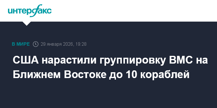 Москва. 29 января. INTERFAX.RU - Соединенные Штаты увеличили свою военно-морскую группировку в зоне ответственности Центрального командования на Ближнем Востоке (CENTCOM) до десяти боевых кораблей с прибытием в регион еще одного ракетного эсминца, сообщил изданию The War Zone представитель американских ВМС.