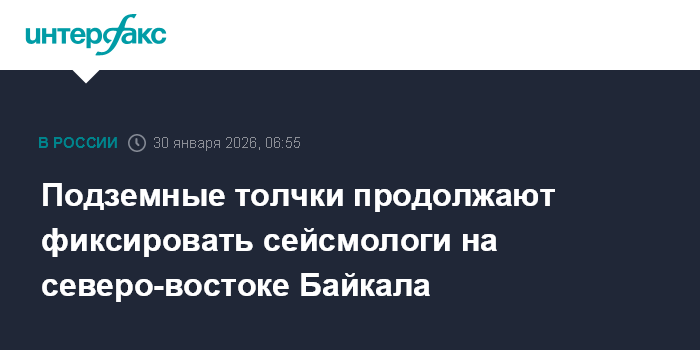 Москва. 30 января. INTERFAX.RU - Еще одно землетрясение зарегистрировано на северо-восточном побережье озера Байкал в Северо-Байкальском районе Бурятии, где с начала января произошло более 10 сейсмособытий, сообщается на сайте Байкальского филиала Единой геофизической службы РАН.