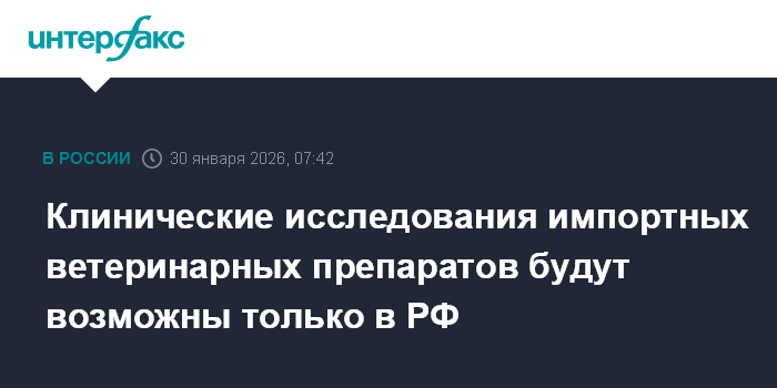 Москва. 30 января. INTERFAX.RU - Группа депутатов внесла в Госдуму законопроект, который устанавливает, что проведение клинических исследований импортных ветеринарных препаратов с 1 сентября 2026 г. будет возможно только на территории РФ, если ранее такой препарат не был зарегистрирован в стране.