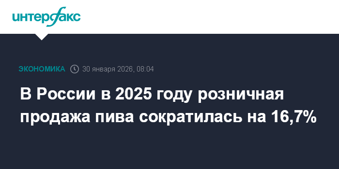 Москва. 30 января. INTERFAX.RU - В России в 2025 году розничная продажа пива составила 607,1 млн декалитров (дал), что на 16,7% меньше, чем в 2024 году (728,9 млн дал), сообщает Росалкогольтабакконтроль.
