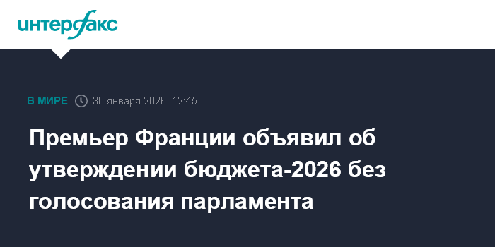 Москва. 30 января. INTERFAX.RU - Премьер Франции Себастьен Лекорню применил статью 49.3 Конституции для утверждения бюджета на 2026 год в обход его вынесения на голосование парламента, сообщает в пятницу телеканал BFM TV.