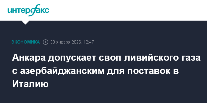 Москва. 30 января. INTERFAX.RU - Турция допускает возможность поставок ливийского газа на итальянский рынок с компенсацией объемов за счет азербайджанского газа по механизму свопа, заявил телеканалу телеканала A Haber министр энергетики и природных ресурсов Турции Алпарслан Байрактар.