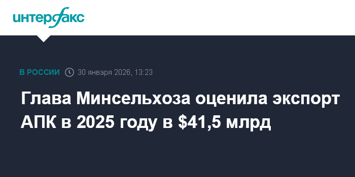 Москва. 30 января. INTERFAX.RU - Глава Минсельхоза Оксана Лут ожидает, что выручка России от экспорта продукции АПК по итогам 2025 года составит до $41,5 млрд. Она сказала об этом телеканалу "Россия 24".