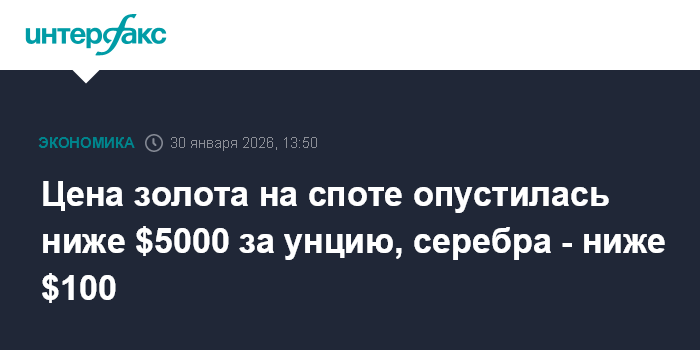 Москва. 30 января. INTERFAX.RU - Цена золота в пятницу опустилась ниже отметки в $5000 за унцию, серебра - ниже $100 за унцию на фоне укрепления доллара США.