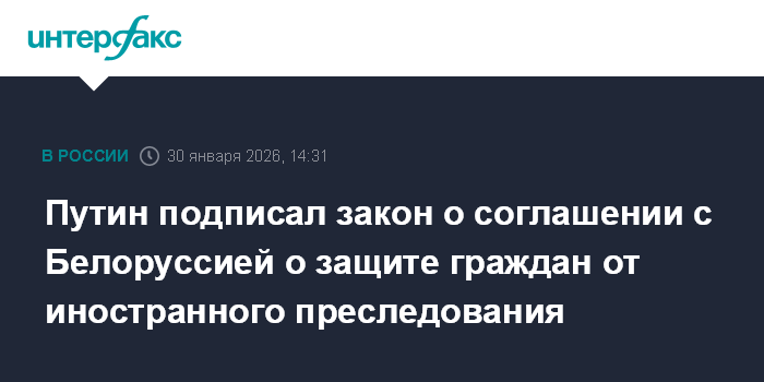 Москва. 30 января. INTERFAX.RU - Президент РФ Владимир Путин подписал закон о ратификации соглашения между Россией и Белоруссией о мерах по взаимной защите граждан от необоснованного преследования иностранными государствами, международными органами юстиции.
