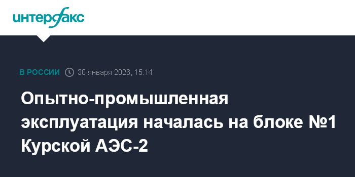 Москва. 30 января. INTERFAX.RU - Первый энергоблок Курской АЭС-2 введен в опытно-промышленную эксплуатацию с планируемым повышением мощности реактора до 100%, сообщил "Росэнергоатом".