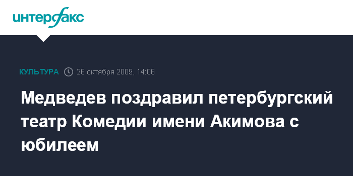 Москва. 26 октября. INTERFAX.RU - Президент России Дмитрий Медведев поздравил творческий коллектив и ветеранов сцены Санкт-Петербургского государственного академического театра Комедии им. Николая Акимова с 80-летием, сообщает пресс-служба главы государства.