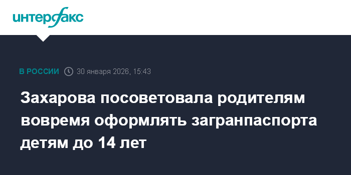 Москва. 30 января. INTERFAX.RU - Российский МИД призывает российских граждан и туроператоров учитывать новые правила, которые с 20 января 2026 года применяются к гражданам в возрасте до 14 лет при выезде в Абхазию, Белоруссию, Казахстан, Киргизию и Южную Осетию, заявила представитель внешнеполитического ведомства Мария Захарова.