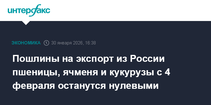 Пошлины на экспорт из России пшеницы, ячменя и кукурузы с 4 февраля останутся нулевыми