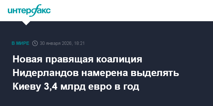 Москва. 30 января. INTERFAX.RU - Следующая правящая коалиция в Нидерландах планирует с 2027 года направлять на поддержку Украины 3,4 млрд евро в год, передает Dutch News.