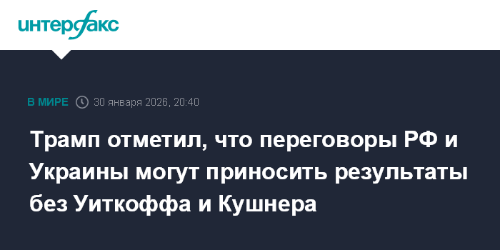 Москва. 30 января. INTERFAX.RU - Переговоры между РФ и Украиной вполне могут приносить плоды и в случаях, когда в них не принимают участие американские переговорщики Стив Уиткофф и Джаред Кушнер, заявил в пятницу президент США Дональд Трамп.