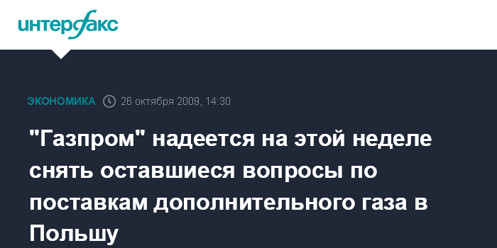 Москва. 26 октября. INTERFAX.RU - "Газпром" надеется на этой неделе снять оставшиеся вопросы по поставкам дополнительного газа в Польшу, сообщил заместитель председателя правления концерна Александр Медведев.
