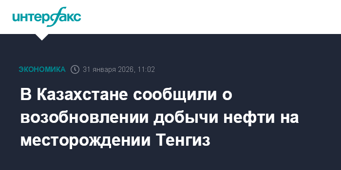 Москва. 31 января. INTERFAX.RU - Добыча нефти на месторождении Тенгиз возобновлена после ее приостановки из-за возгорания трансформаторов, сообщила пресс-служба министерства энергетики Казахстана.