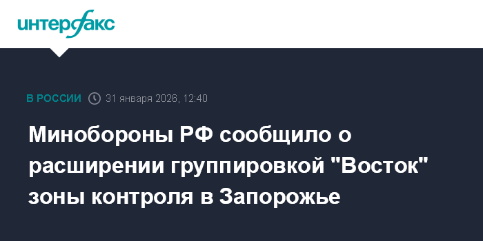 Москва. 31 января. INTERFAX.RU - Подразделения группировки "Восток", взяв под контроль населенный пункт Петровка в Запорожской области, расширяют зону контроля на линии боевого соприкосновения с противником, сообщило в субботу министерство обороны РФ.