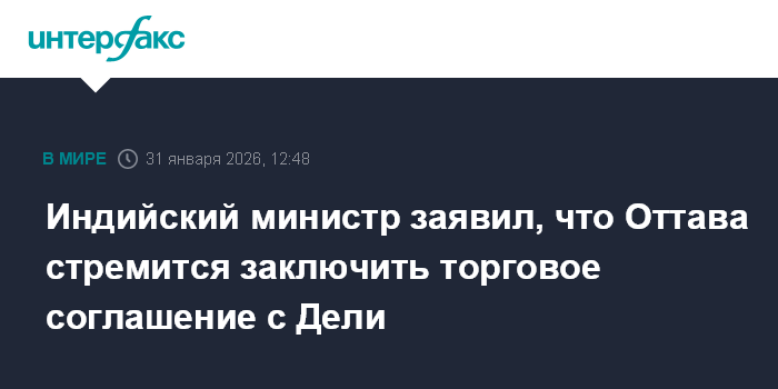 Москва. 31 января. INTERFAX.RU - Министр торговли и промышленности Индии Пиюш Гоял заявил, что Канада всерьез настроена на заключение торгового соглашения с его страной.