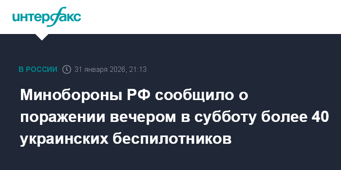Москва. 31 января. INTERFAX.RU - Российские военные сообщили, что с 17:00 до 20:00 по Москву субботы дежурными средствами ПВО уничтожен 41 украинский беспилотный летательный аппарат самолетного типа.