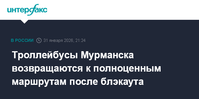 Москва. 31 января. INTERFAX.RU - Троллейбусы Мурманска возвращаются к полноценным маршрутам после нарушения электроснабжения, которое произошло в субботу в Мурманске, сообщил Минтранс Мурманской области.