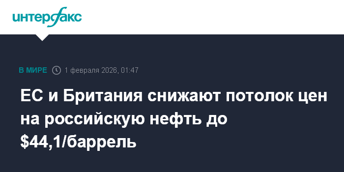 Москва. 1 февраля. INTERFAX.RU - Потолок цен на нефть, который позволяет европейским компаниям участвовать в транспортировке российской нефти, с февраля снижается до $44,1 за баррель, аналогичный уровень установлен Великобританией с 31 января.